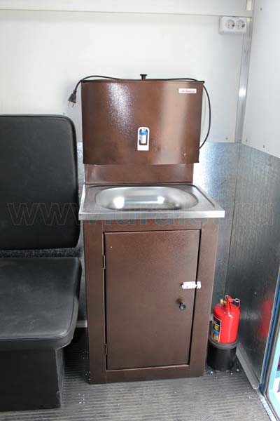 Передвижная мастерская оборудована умывальником, одежным шкафом и рундуком.