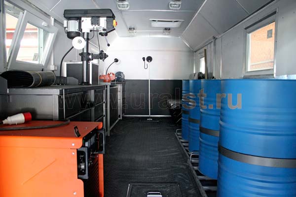 Мобильная ремонтная мастерская оснащена всем необходимым оборудованием и инвентарем для проведения ремонтных и восстановительных работ: