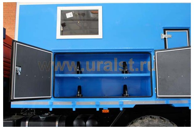 Еще одной особенностью фургона является выдвижной трап и съемная лестница, по которым осуществляется вход персонала внутрь ремонтного отсека, а также доступ к нишам кузова-фургона. Для удобства и экономии пространства трап и лестница в транспортном положении убираются в нишу под полом автофургона. Их конструкция предусматривает широкие ступеньки, по которым легче производить спуск и подъем. Ступеньки трапа изготовлены из просечного стального листа, что делает их более травмобезопасным.