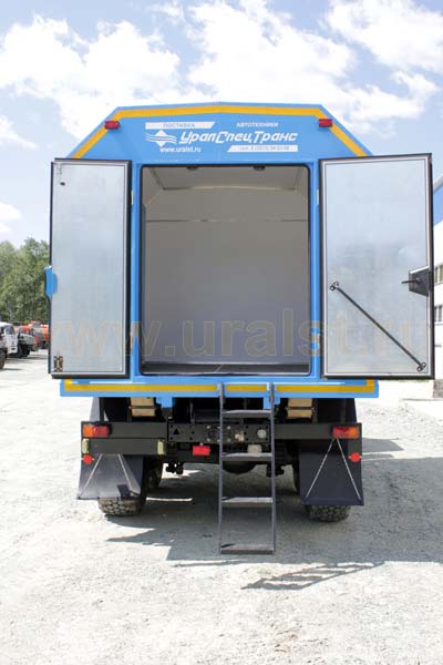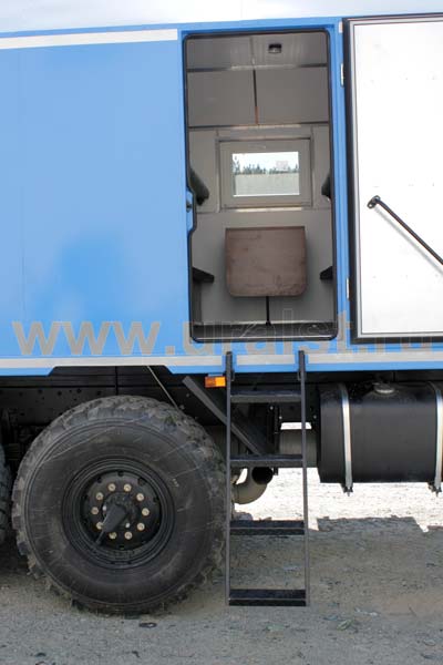 Еще одной особенностью фургона является съемная лестница, по которой осуществляется вход персонала и перемещение грузов внутрь фургона. Для удобства и экономии пространства, лестница в транспортном положении убирается в нишу под полом фургона. Конструкция лестницы предусматривает широкие ступеньки, по которым легче производить спуск и подъем внутрь фургона.