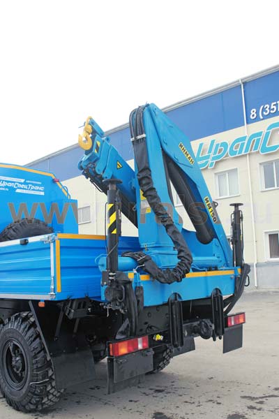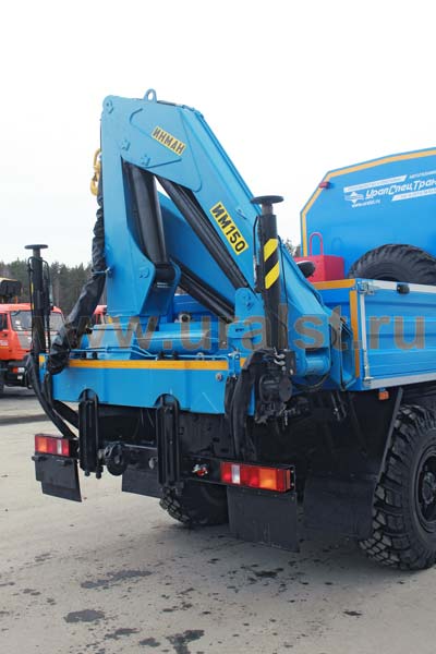 На заднем свесе фургона смонтирован манипулятор ИМ-150 для проведения грузоподъемных работ весом до 6,05 тонн.