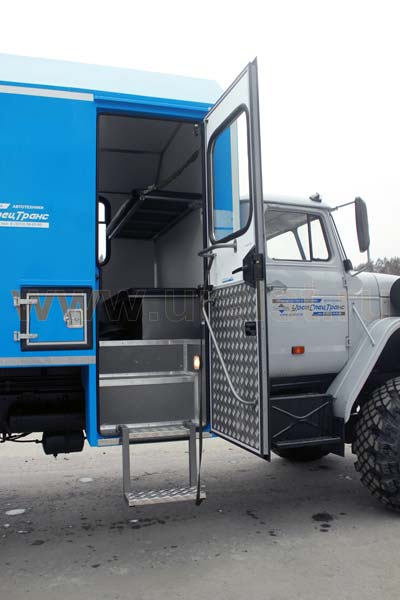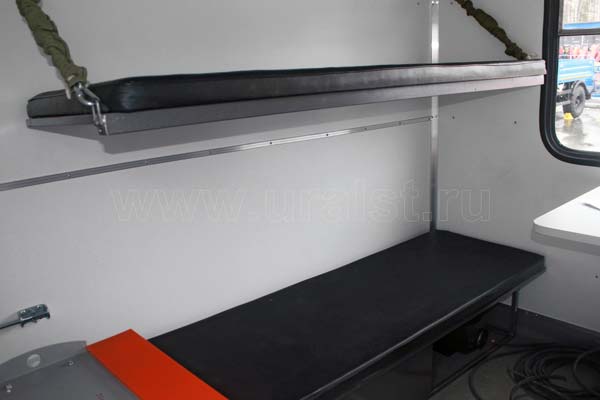 Фургон ТБМ разделен на 2 отсека: грузовой отсек и отсек для кратковременного отдыха персонала. ТБМ оборудован двумя диванами-рундуками с откидными полками и столом.