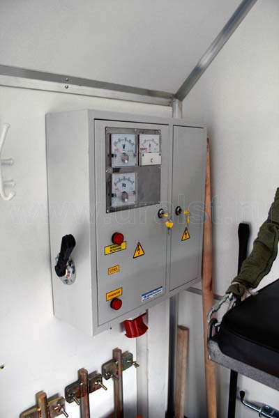 Дополнительно фургон ТБМ укомплектован сварочным выпрямителем. Для быстрого использования и удобства работы со сварочным выпрямителем в кузове-фургоне ТБМ предусмотрен специальный люк. Питание сварочного выпрямителя осуществляется от генератора мощностью 38 кВА, либо внешнего источника питания, для подключения которого предусмотрен специальный разъем. Защита потребителей и цепей 380В и 220В от перегрузок и короткого замыкания обеспечивается соответствующими автоматическими выключателями и модулем защитного отключения установлеными в шкафу управления.