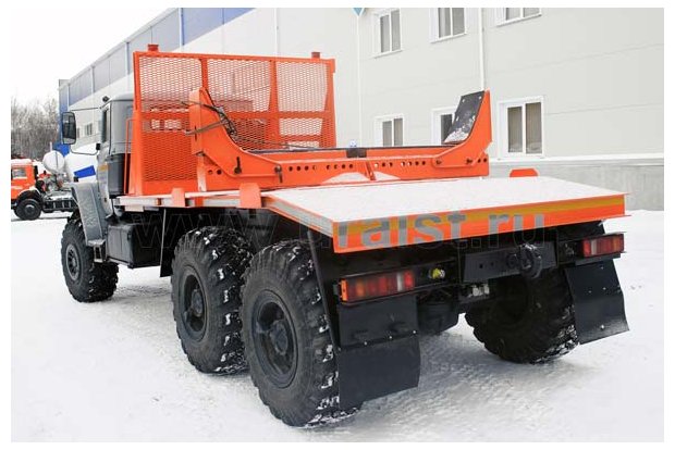 Тягач трубовозный на базе шасси Урал 4320 предназначен для транспортировки труб по всем видам дорог и местности в составе автопоезда с прицепом-роспуском. Коники тягача усилены и обрезинены, что позволяет избежать скольжения транспортируемых труб.