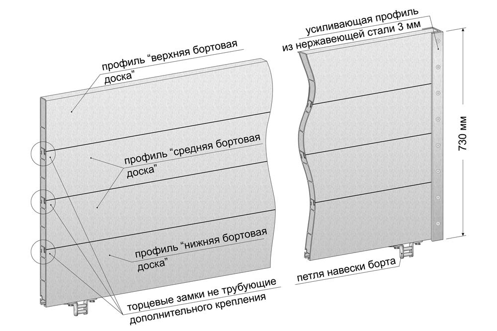 Наборный борт может быть изготовлен различной длины и высоты. Доска из алюминия соединятся между собой при помощи торцевых замков, не требующих дополнительного крепежа, необходимая высота борта достигается набором алюминиевой доски. Дополнительно, по краям, борт усиливается «П» - образным профилем из нержавеющей стали толщиной 3 мм, служащим также для закрывания пустот между ребрами жесткости профиля. Крепление бокового «П» - образного профиля к борту осуществляется при помощи клепки. Такая конструкция имеет необходимую жесткость и небольшой вес.