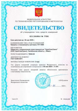 Свидетельство об утверждении типа средств измерений № 77292 от 11.05.2020 г. подтверждает, что прицеп-цистерны производства «УралСпецТранс» успешно прошли технические и метрологические испытания и допущены к эксплуатации на территории РФ. Данное свидетельство удостоверяет, что емкость соответствует заявленному объему, и не требует дополнительных средств измерения объема при заполнении.
